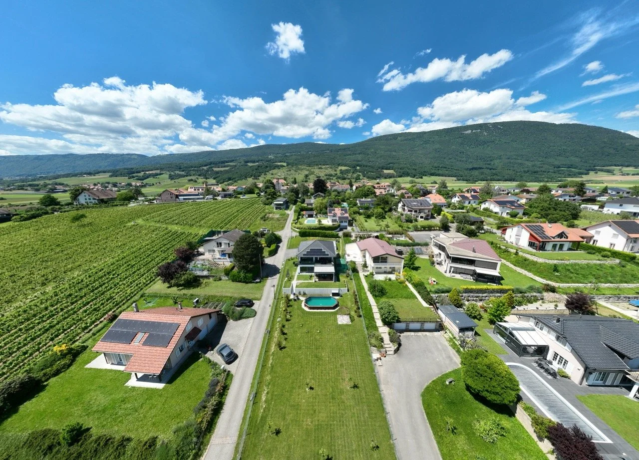 Reveal émotionnel montrant la maison achevée avec piscine et aménagements extérieurs.